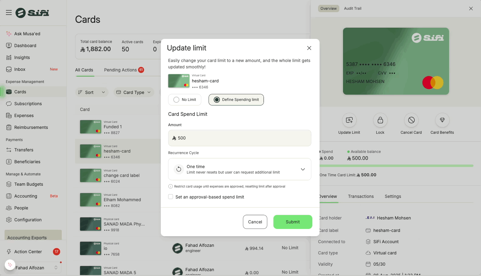 Employee is issued a SiFi card with a 5,000 SAR approval-based limit.