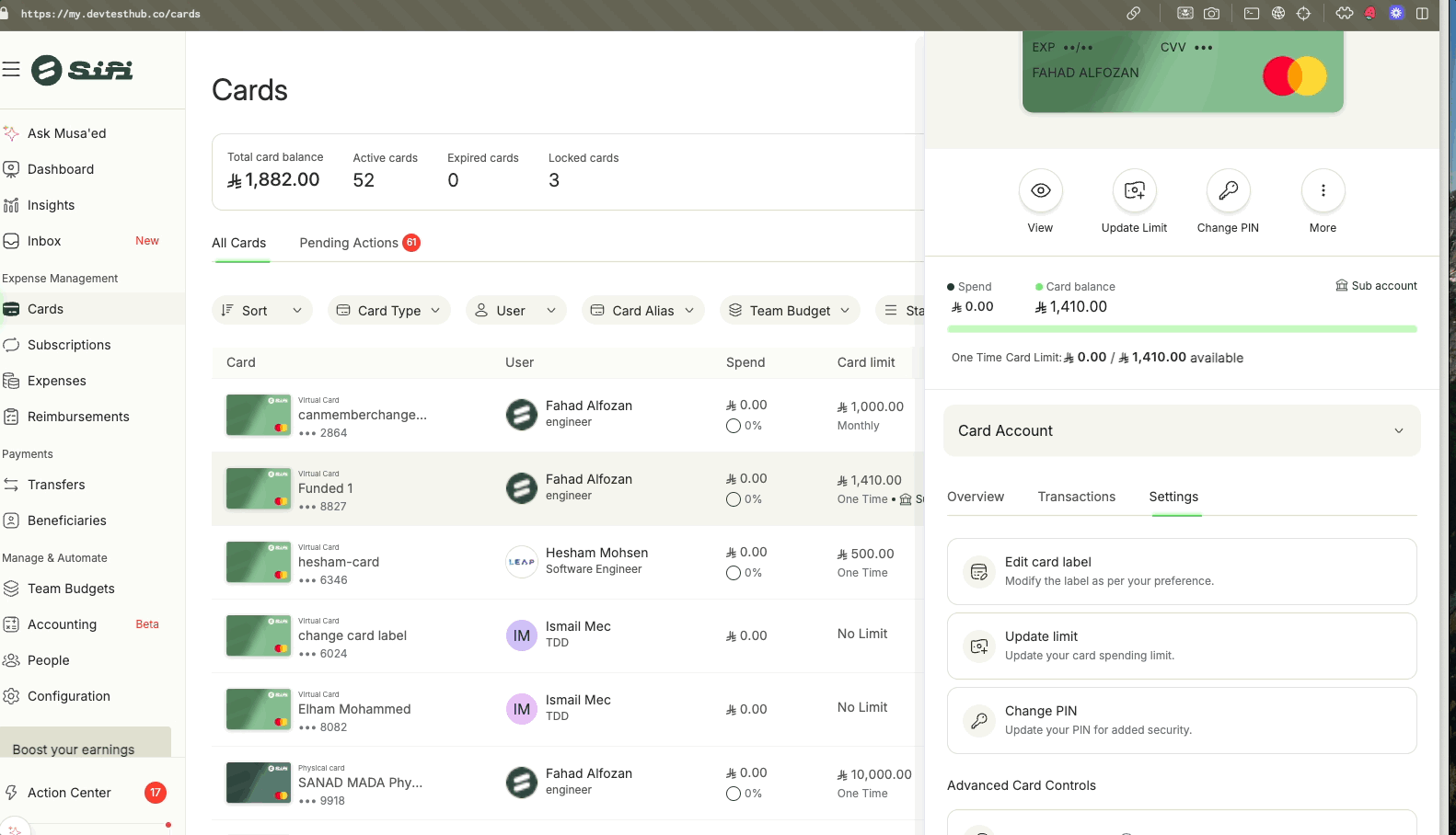 👉 Important: Card limits do not reduce your company balance upfront. Your balance only decreases when the card is actually used for a transaction.Cardholders cannot change their own limits.