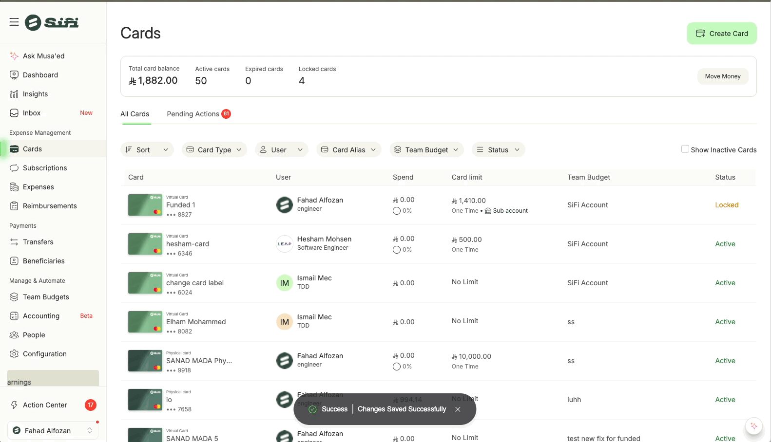 Managing cards in SiFi is simple and gives both Admins and Cardholders full visibility into issued cards and control over their lifecycle. π Viewing Cards You can view all cards created for employees, including those pending activation: Go to the ...